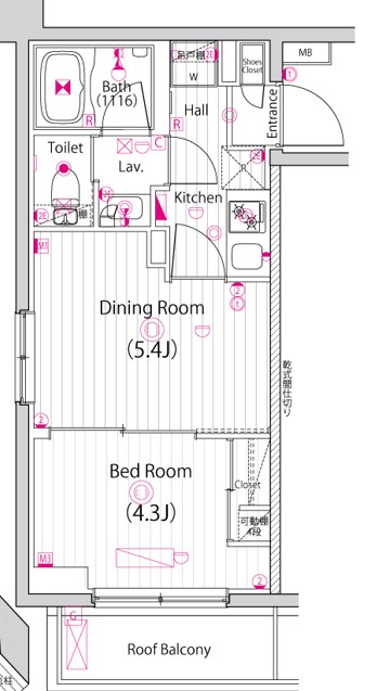 | 物件概要 | 間取り | 1DK | 専有面積 | 27.77m2 | バルコニー面積 | 3.43m2 |